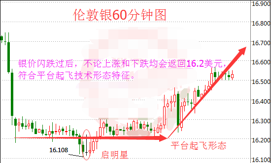 ②如果说启明星仅为看涨信号,那么伦敦银“平台起飞”技术形态的出现,则更加表明银价牛市行情的开启。如上图所示,银价短线急跌过后震荡于16.2美元附近,伦敦银涨跌幅度紧紧围绕16.2美元,符合“平台起飞”技术形态的基本特征。